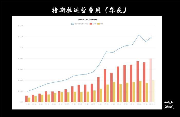 稍等,再看看特斯拉复杂的运营费用(SG&A发卖成本、分析开销及行政办理三项费用+R&D研发经费),每季度运营费用12亿美金摆布。